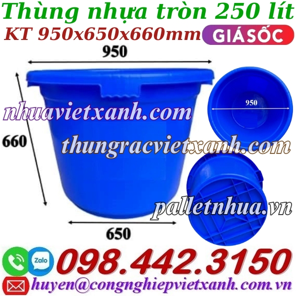 *. Thùng tròn 250L – thùng nhựa tròn 250 lít – tank nhựa tròn 250L chuyên dụng nhúng sầu riêng và thường được sử dụng nhiều trong ngành thủy hải sản, ngành xây dựng hay trong đời sống…để chứa nước, đựng nước, trồng rau, nuôi cá, nuôi tôm, nuôi lươn, nuôi ốc, nuôi cá Koi, làm bể bơi,…và với đặc điểm lớn nhất là kháng acid, kháng kềm, không tan trong dung môi và không phân cực nên thùng còn được dùng để đựng hóa chất, dung môi, thuốc nhuộm vải,…Ngoài ra thùng còn được dùng rất nhiều trong Hệ thống Aquaponics – rau xanh cá sạch.